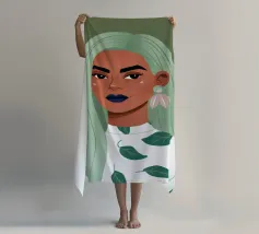 Il dipinto raffigura una persona con capelli corti e scuri acconciati a onde, che indossa un abito con motivi retrò e cerchi e diamanti nei toni del rosa, del marrone e del beige. Lo sfondo è di un semplice colore beige chiaro.