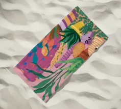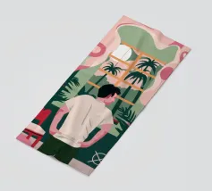 Un'illustrazione di una stanza vivace e in stile bohémien è assolutamente piena di una collezione di piante in vaso e cactus su un tappeto a righe colorate, creando un rifugio perfetto per un amante delle piante.
