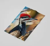 Il picchio è appollaiato su un tronco d'albero, con il corpo slanciato e un misto di piume rosso vivo sulla testa, nere sul dorso e striature bianche evidenti sulle ali. Le sue forti zampe si aggrappano saldamente al tronco verticale dell'albero. I suoi occhi acuti sono diretti verso l'obiettivo, emanando un senso di intelligenza, pronti a battere ritmicamente sul tronco dell'albero in cerca di prede. Lo spazio circostante emana la selvaticità della foresta, evidenziando l'aspetto operoso e forte di questa speciale specie di uccello.