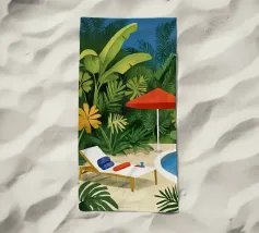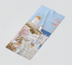 L'immagine mostra un idilliaco paesaggio costiero con case imbiancate a calce, porte e finestre blu e tetti color arancio, che si adagiano come terrazze su una scogliera rocciosa. Sullo sfondo svetta un mulino a vento, mentre il mare blu intenso luccica sotto un cielo limpido. Una vegetazione rigogliosa e fiori colorati costeggiano i sentieri. Lo stile è pittoresco e romantico, ispirato all'architettura mediterranea - in particolare all'isola greca di Santorini - e trasmette tranquillità, calore e bellezza senza tempo.