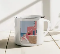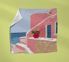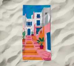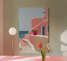 Una classica scena mediterranea che raffigura un edificio rosa con una scala che scende verso un tranquillo mare blu. Quest'opera d'arte cattura perfettamente il fascino solare e pacifico di un'isola greca.