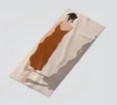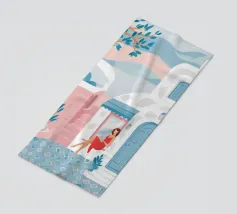 Un'elegante illustrazione di una donna che si rilassa su una scala illuminata dal sole accanto a una palma in vaso, con un gatto seduto vicino. La scena, incorniciata da un arco, è serena, elegante e ha un'atmosfera mediterranea classica.