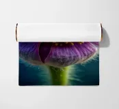 Una ripresa macro cattura i dettagli intricati di un fiore di papavero. Il fiore presenta petali viola, un centro rosso e un pistillo verde. Gli stami arancioni circondano il centro. Lo sfondo è di un blu scuro sfocato. L'immagine mette in evidenza le trame delicate e i colori vivaci del fiore.