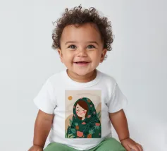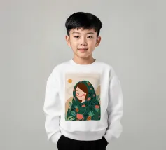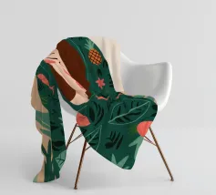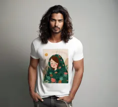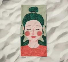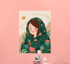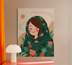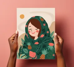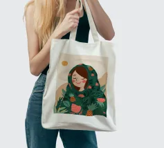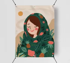 Ritratto di una donna che indossa un foulard colorato, con il volto incorniciato da foglie verdi e da una stampa di ananas. La composizione è una vibrante, elegante e bellissima celebrazione della moda e della bellezza tropicale.