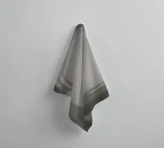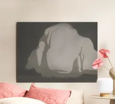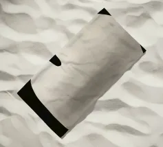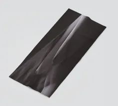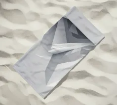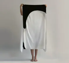 Una rappresentazione monocromatica presenta una forma accartocciata che ricorda in qualche modo una montagna o una formazione rocciosa. Le ombre e le lumeggiature sono state utilizzate per dare alla forma un aspetto tridimensionale, e poggia su uno sfondo più scuro che ne esalta la silhouette.