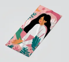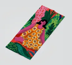 Illustrazione di una donna con top giallo a pois e pantaloni rosa, sdraiata sul pavimento. La sua posa rilassata e soddisfatta crea una scena di comodo, elegante e tranquillo svago.
