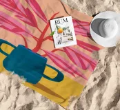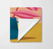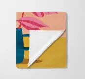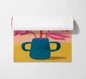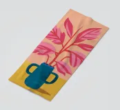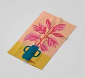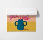 Un'illustrazione semplice ma d'effetto di una pianta dalle foglie rosa in un audace vaso blu su uno sfondo caldo, che celebra la bellezza del colore e della forma botanica minimalista.