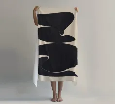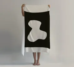 Una grande forma nera irregolare è posizionata al centro su uno sfondo più chiaro a contrasto, dall'aspetto ruvido e strappato. Il design è minimalista, con un'atmosfera astratta e una tavolozza di colori semplice.