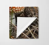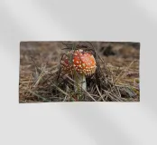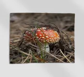 Una piccola mosca agarica fa capolino dal suolo della foresta, emergendo da una coltre di aghi di pino: la sorpresa silenziosa della natura.