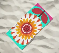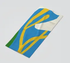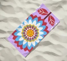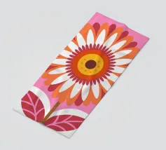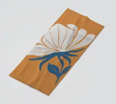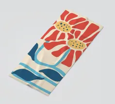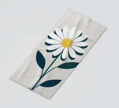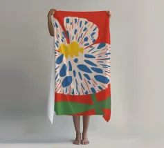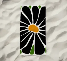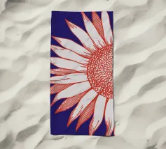 Un'illustrazione audace e grafica di un singolo grande fiore, probabilmente un anemone, con petali a strisce bianche e blu e un centro giallo. Lo sfondo rosso brillante rende il fiore il fulcro assoluto di questo pezzo potente.