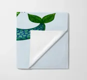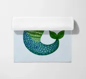 L'illustrazione mostra un'allegra sirena con lunghi e fluenti capelli blu, guance rosee e un ampio sorriso. La sua parte superiore ricorda le squame di un pesce e la sua pinna caudale è blu con accenti verdi. Lo stile è giocoso e infantile, con linee pulite e colori vivaci. La texture sullo sfondo conferisce all'immagine un tocco artigianale e affascinante.