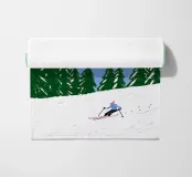 "Ski you later": un gioco di parole che unisce sport invernali e umorismo. L'illustrazione mostra uno sciatore su una pista bianca, incorniciata da abeti verde intenso e montagne color pastello. Un'immagine che cattura la leggerezza dello sci e allo stesso tempo evoca un sorriso. Perfetta per chi ama l'inverno, le montagne e il buon umore. Moderna, giocosa e un vero e proprio eye-catcher per la stagione invernale.