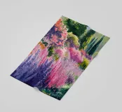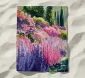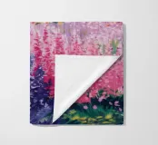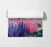 Un prato è pieno di alte guglie di fiori di lupino rosa e viola, le cui forme morbide e verticali creano un paesaggio romantico e sognante che sembra rigoglioso e pieno di vita.
