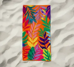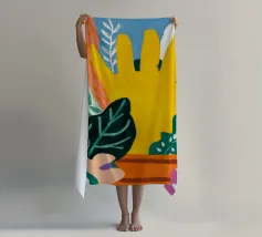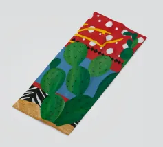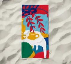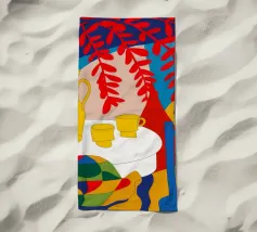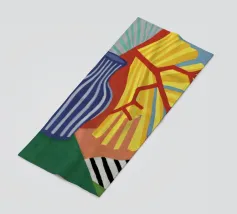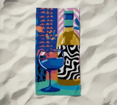 Una natura morta astratta e altamente stilizzata che presenta una bevanda in un bicchiere di vimini con una cannuccia blu. La scena è ambientata su una superficie con audaci motivi rossi e gialli, su uno sfondo verde strutturato.