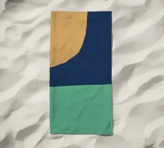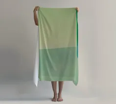 Domina uno stile minimalista con ampie fasce di colore blu, verde e viola, separate da linee rette per creare una composizione segmentata. L'elemento centrale ricorda un paesaggio stilizzato con un primo piano, un orizzonte e un cielo semplificati.