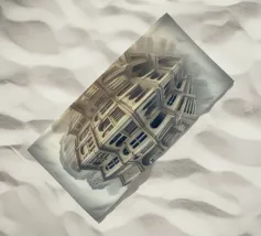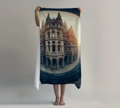 Una struttura architettonica circolare mozzafiato con archi intricati, colonne e una grande scalinata emana eleganza e simmetria. Gli accenti di verde lussureggiante e il cielo drammatico esaltano l'atmosfera artistica e surreale di questo design unico.