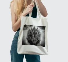 Una composizione surreale in bianco e nero con un'imponente struttura architettonica di ispirazione gotica circondata da acque ferme sotto una forte pioggia. L'illuminazione drammatica e il design intricato evocano un'atmosfera di struggente bellezza.