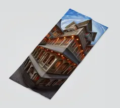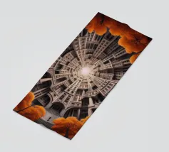Una drammatica prospettiva fisheye in bianco e nero che mostra un'intricata simmetria architettonica con linee curve, finestre ad arco e motivi geometrici. Il gioco di luci e ombre crea profondità e mistero, evocando un senso di eleganza surreale.