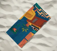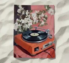 Questa accogliente illustrazione in stile stilistico con colori caldi ritrae una mano umana che suona un disco su un vecchio giradischi. Una tazza di caffè, un vaso di fiori davanti a una finestra con un bel paesaggio completano l'immagine.