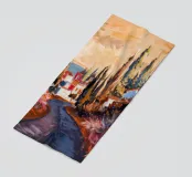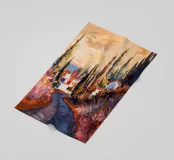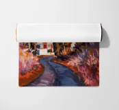 Una strada tortuosa fiancheggiata da alti cipressi è immersa nella calda luce dorata del crepuscolo; lo stile espressivo e pittorico crea un viaggio sognante e romantico attraverso la campagna.