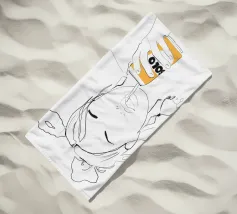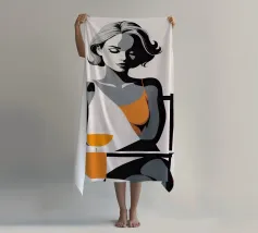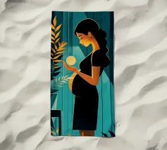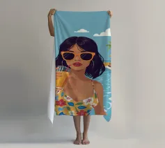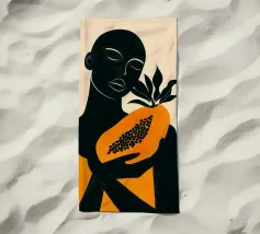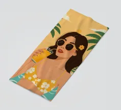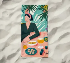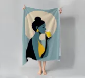 Un'illustrazione audace ed elegante di una donna che sorseggia una bevanda fresca sotto l'alone luminoso del sole. La tavolozza di colori retrò, verde acqua e oro, dona calore, energia e personalità a qualsiasi ambiente. Ideale per cucine, caffè, bar e spazi moderni e luminosi.