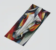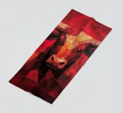 Una rappresentazione astratta e imponente della testa di un toro, costruita con piani sovrapposti, texture consumate e un'intensa profondità tonale. Sullo sfondo di un potente campo rosso, la forma appare monumentale e simbolica, evocando forza, determinazione e presenza grezza. Le superfici frammentate e i dettagli simili a collage aggiungono complessità, conferendo all'opera un senso di storia e peso sotto il suo aspetto audace.