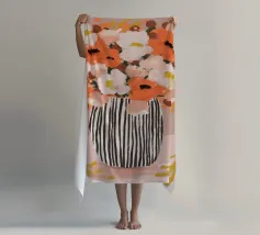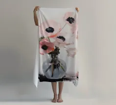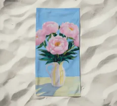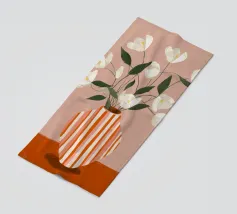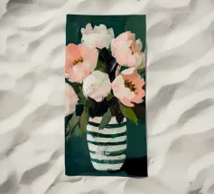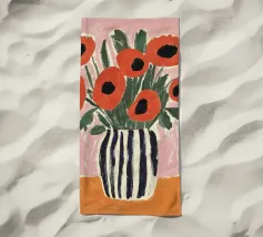 Questa illustrazione minimalista mostra un'elegante tazza di ceramica a righe bianche e nere, circondata da fiori rosa e foglie verdi. Sullo sfondo beige, l'allegro bouquet di fiori irradia leggerezza estiva e porta la freschezza botanica in ogni stanza!