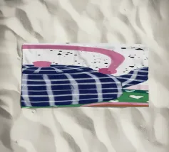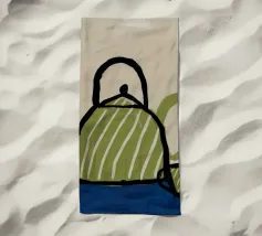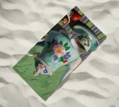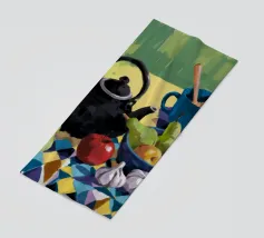 Una natura morta calma e composta di una teiera verde e blu e di una tazza rosa appoggiate su un panno a righe bianche e blu. I limoni a fette aggiungono un tocco di freschezza a questa serena e invitante scena dell'ora del tè.