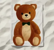 The picture shows a lovingly drawn teddy bear illustration with soft, brown fur and beige-coloured accents on the snout, tummy and feet. The bear wears a dark green bow tie and looks out into the world with round black eyes. The style is classic and nostalgic, with a warm, textured background surface reminiscent of wood or canvas. It radiates a sense of security and childlike light-heartedness.