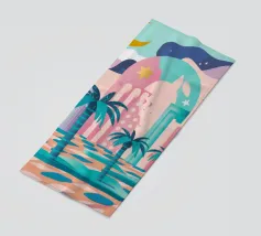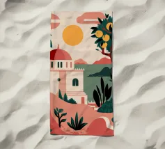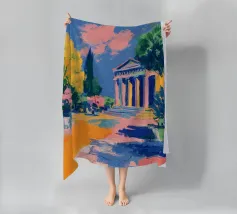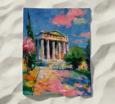 Questo colorato dipinto a guazzo raffigura un antico tempio greco in lontananza, circondato da palme e colori vivaci sotto un sole splendente. In stile Risograph, con un design piatto, una tavolozza di colori pastello, contorni netti e pennellate decise, trasmette minimalismo, simpatia ed elevata espressività. La texture a guazzo, i contorni netti e l'elevato contrasto creano un'interpretazione moderna e grafica dell'architettura classica su sfondo bianco, combinando armoniosamente semplicità e vivacità.