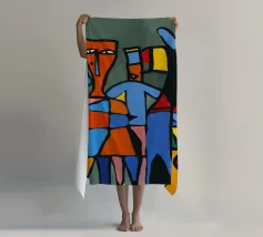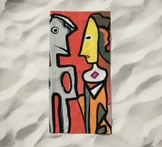 Due figure stilizzate dominano la composizione, caratterizzate da forme astratte e colori vivaci. Una figura appare di profilo mentre l'altra è rivolta in avanti, entrambe con tratti esagerati e una qualità stravagante.