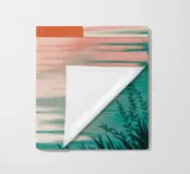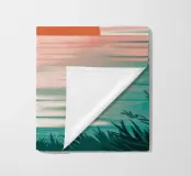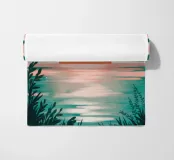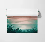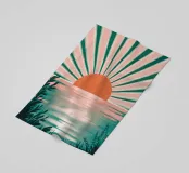 Una rappresentazione grafica e serena di un sole che tramonta su un mare calmo e verde smeraldo. I raggi solari stilizzati e l'acqua tranquilla creano un paesaggio pacifico e moderno con un'atmosfera di speranza.