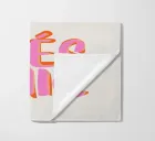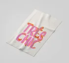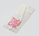 This image features a bold and playful typographic design with the phrase "TRÈS CHIC" prominently displayed. The text is written in a stylised uppercase font, with each letter filled in a bright pink. The letters have an orange shadow effect, which adds depth to the text and makes it stand out against the bright off-white background. The overall design is simple but eye-catching, combining bright colours with a fashionable and trendy expression.