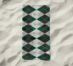 Le forme geometriche sono disposte su uno sfondo strutturato, caratterizzato da un motivo a griglia verde acqua. I triangoli di varie tonalità creano un contrasto visivo dinamico.