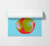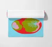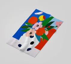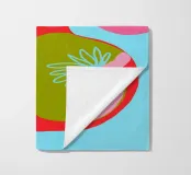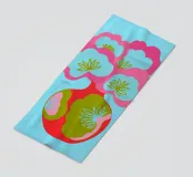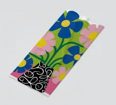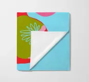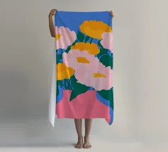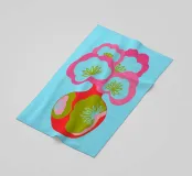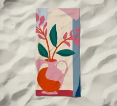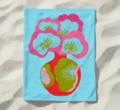 Questa colorata illustrazione grafica mostra un grande bouquet di fiori in un vaso, che delizia con elementi giocosi disegnati a mano in rosa, azzurro e verde. Il design minimalista e astratto combina motivi botanici con un'estetica pop art. Ideale per una decorazione d'interni vivace.