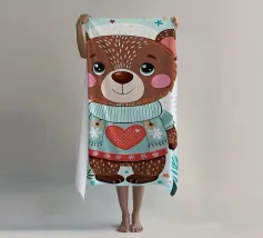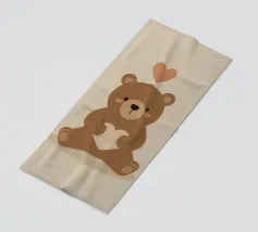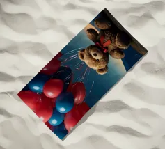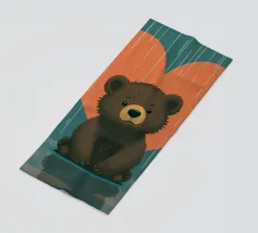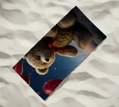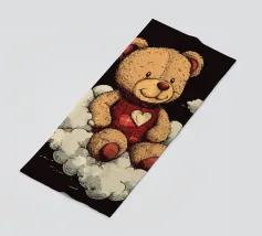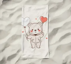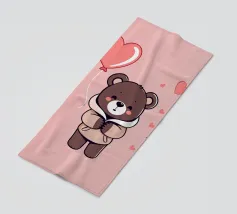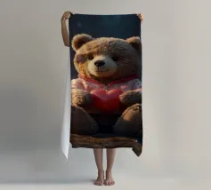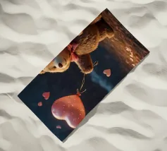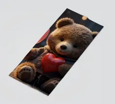 Un simpatico orsacchiotto vestito con un'accogliente felpa con cappuccio siede nella neve, tenendo gioiosamente un cuore rosso mentre un palloncino si muove nell'aria fresca della sera sotto un tramonto colorato.