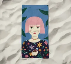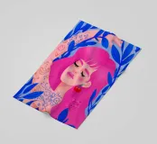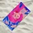 This artwork features a figure with pink hair, set against a background filled with blue and pink floral elements. The scene is vibrant and whimsical, full of playful energy.