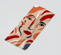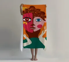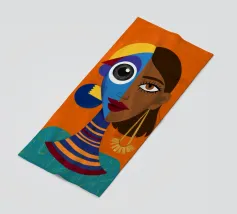 Un suggestivo ritratto astratto di un volto di donna, diviso in due metà, una nera e una bianca, con labbra rosse e capelli fluenti su un caldo sfondo arancione.