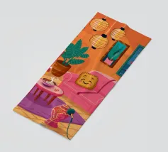 Un'illustrazione vivace di un soggiorno eclettico e massimalista con mobili colorati, una parete a galleria, numerose piante d'appartamento e un tappeto viola.
