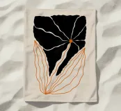 Wavy Black Bold Flower presenta un fiore unico con grandi e fluenti petali neri e foglie a forma di onda in un morbido disegno giallo-arancio. Un pezzo floreale sorprendente e insolito, perfetto per aggiungere un audace accento artistico a una galleria di pareti moderne.
