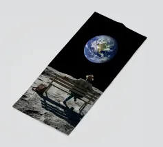 Vivevamo lì. Ricordate? Quel mondo ci sta ancora aspettando. ~ Coppia seduta su una panchina che guarda la Terra surreale retro futuristico stellato composizione romantica. versione orizzontale