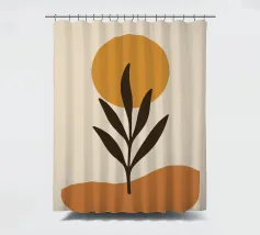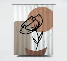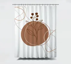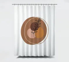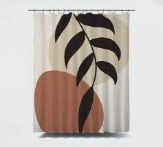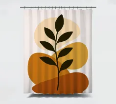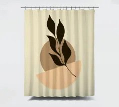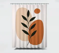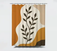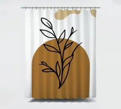 Una composizione astratta presenta un semplice sfondo geometrico marrone e beige con un delicato disegno al tratto di un ramoscello frondoso. Il design minimalista enfatizza gli elementi naturali in un equilibrio armonioso.