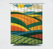 Un paesaggio vibrante di campi coltivati, ricchi e ondulati, sotto un cielo soleggiato con nuvole soffici. La rappresentazione stilizzata e colorata della campagna celebra la bellezza e l'abbondanza dei terreni agricoli.