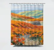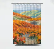 Le colline ondulate si infiammano dei colori arancio e rosso fuoco del fogliame autunnale, creando un paesaggio vibrante, ampio e caldo che celebra la bellezza della stagione.