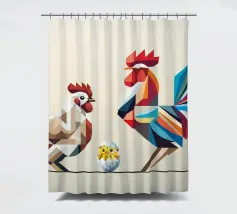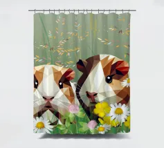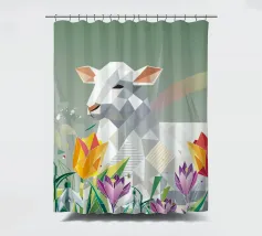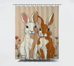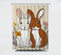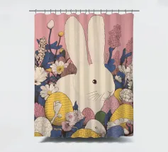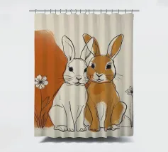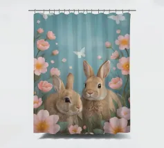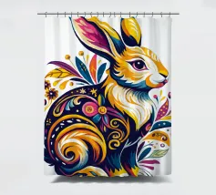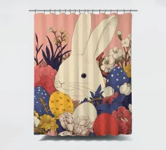 Due coniglietti pasquali stilizzati tra fiori colorati, pulcini e farfalle: un motivo allegro in stile poligonale, ideale per il periodo pasquale e l'inizio della primavera.