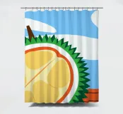 Illustrazione che mostra un frutto di durian spaccato, con un cielo blu e nuvole sullo sfondo.