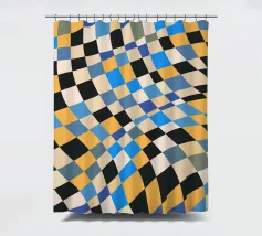 Audaci motivi geometrici si intrecciano con un sorprendente accento giallo in un design che enfatizza il contrasto. Le forme curve e angolari in bianco e nero creano un flusso visivo dinamico.