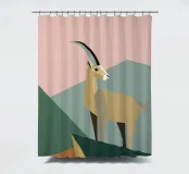 Illustrazione moderna di uno stambecco in stile geometrico flat design davanti a un paesaggio montano stilizzato. Forme chiare, una tavolozza di colori ridotta e un design contemporaneo rendono questo motivo un'attrazione speciale. Ideale per gli amanti delle Alpi, gli amanti della natura e gli appassionati di illustrazioni animali minimaliste alla ricerca di un'elegante immagine di animali di montagna.
