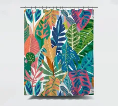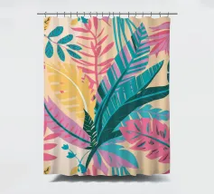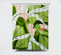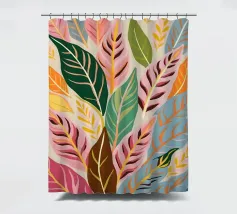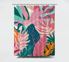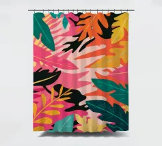Questa vibrante opera d'arte presenta una composizione dinamica di foglie tropicali in colori audaci e contrastanti. L'opera presenta un mix di fogliame verde intenso, rosa tenue e arancione brillante, con intricati motivi di venature che aggiungono consistenza e dettagli. Il gioco di toni caldi e freddi crea un'atmosfera vivace ed energica, mentre lo sfondo pulito color crema permette alle foglie di risaltare in modo evidente. L'approccio grafico e stilizzato conferisce all'opera un'estetica moderna e giocosa, evocando la bellezza lussureggiante della natura in un design contemporaneo.