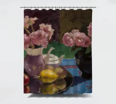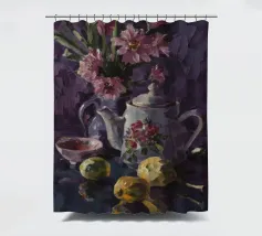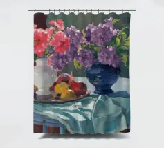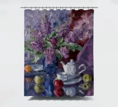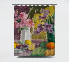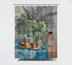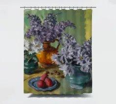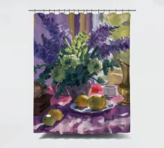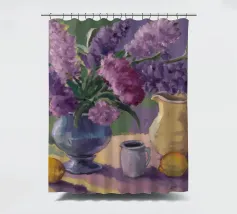 Una natura morta con una brocca d'argento riempita con un rigoglioso bouquet di lillà viola e rosa. Un bicchiere di vino rosso e della frutta si trovano su una superficie scura e lucida che riflette gli oggetti.